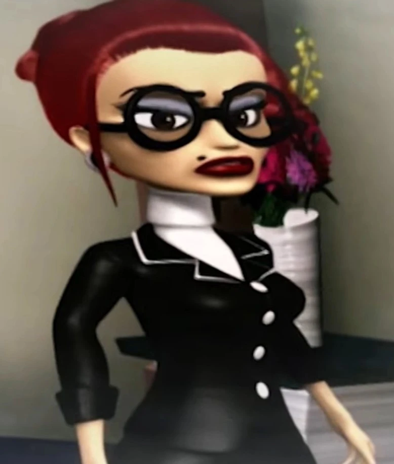 She always wears a black dress suit and thick black rimmed glasses.